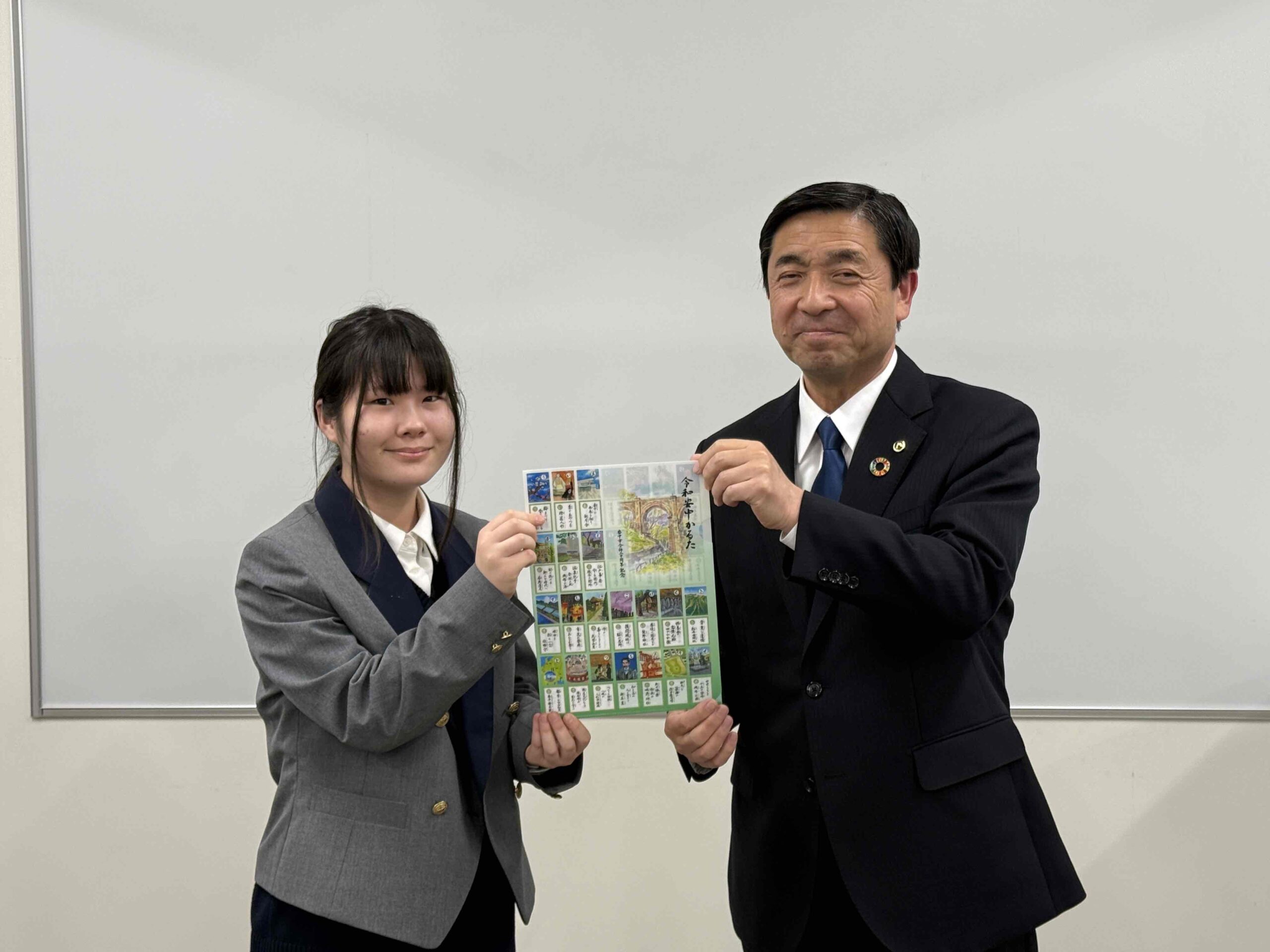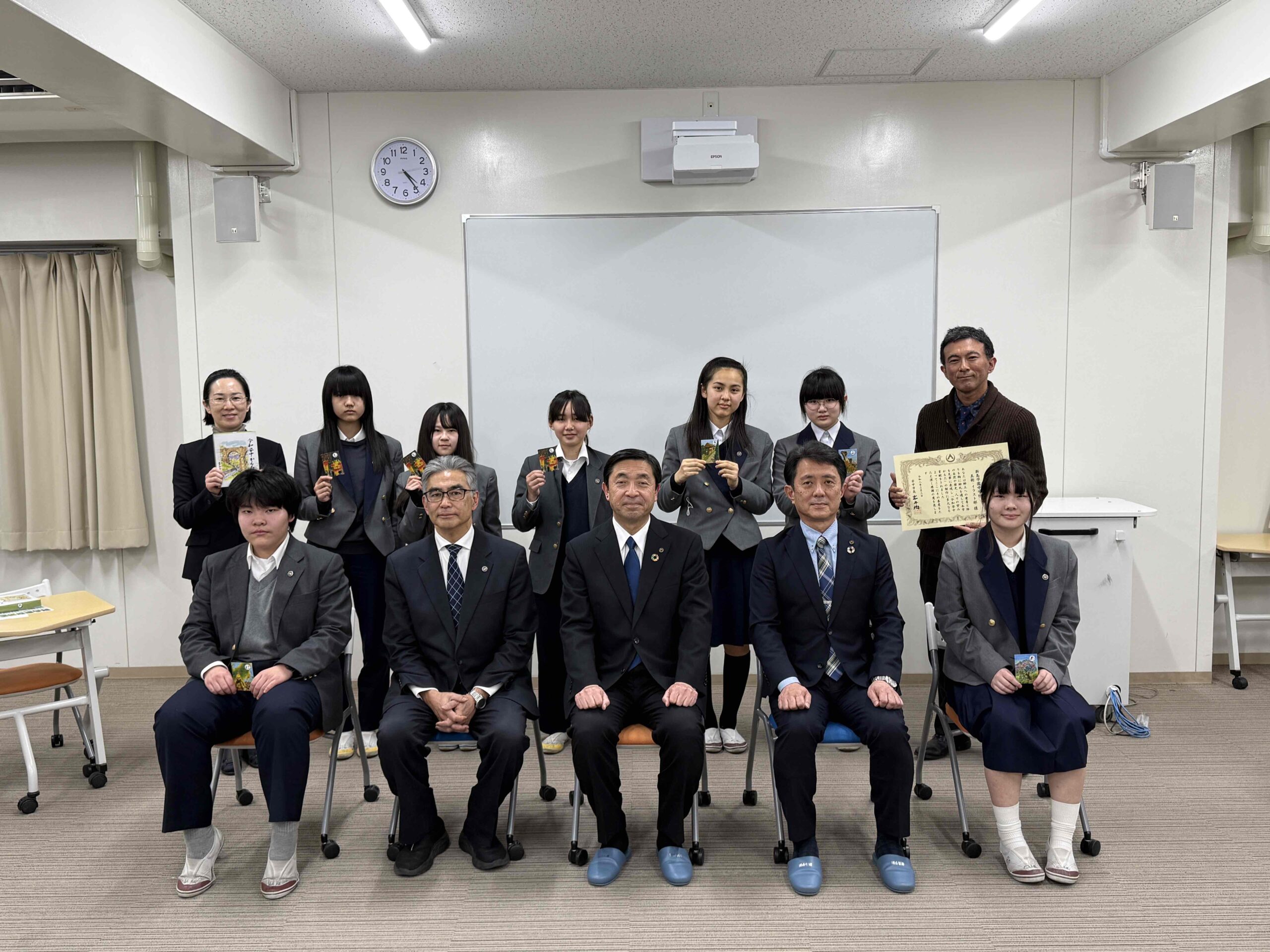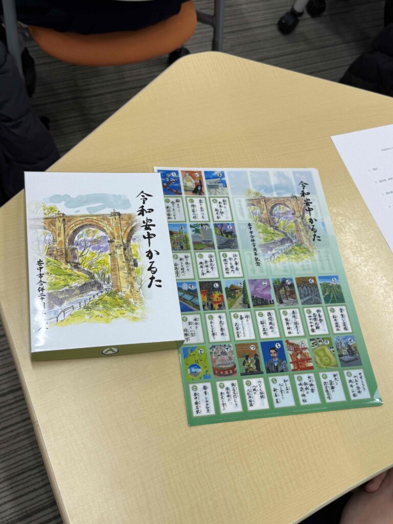 3月3日(火曜日)16時より、本校ラーニングコモンズにおいて令和安中かるた原画制作感謝状贈呈式が行われました。 安中市から清水昭芳副市長、岩﨑聡教育長、井上昇教育部長および関係の職員の方々がご来校され、イラスト部の中学生13名が参加しました。 賞状や記念品、完成したばかりの令和安中かるたと記念クリアファイルをお贈りいただきました。 生徒たちも緊張した面持ちと同時に嬉しそうな表情も浮かべておりました。 ご来校の上、贈呈式を行っていただいた安中市の皆さまに深く感謝申し上げます。 令和安中かるたは、2006年に合併した松井田町の遺構や文化、人物などを加えて新調したものです。 本校は昨年の春に、令和安中かるたの「か、け、さ、し、て、に、ふ、へ、め、わ」の10枚の原画制作を安中市教育委員会より依頼され、夏から秋にかけて制作しました。 その中には、県境に位置する熊野神社や古道東山道、和算と測量の小野栄重など、私たちが初めて耳にする神社や歴史、人物があり、改めて安中 松井田の文化を知る機会となりました。また、原画の構図なども何度もご助言いただいたことは、美術的にも貴重な学びとなりました。 この度、令和安中かるたが完成し、私たち新島学園美術イラスト部が貢献できたことを嬉しく思いますし、実物のかるたを見ると感慨深いものがあります。 この令和安中かるたが、安中市民を中心に広く長く親しまれることを願っています。