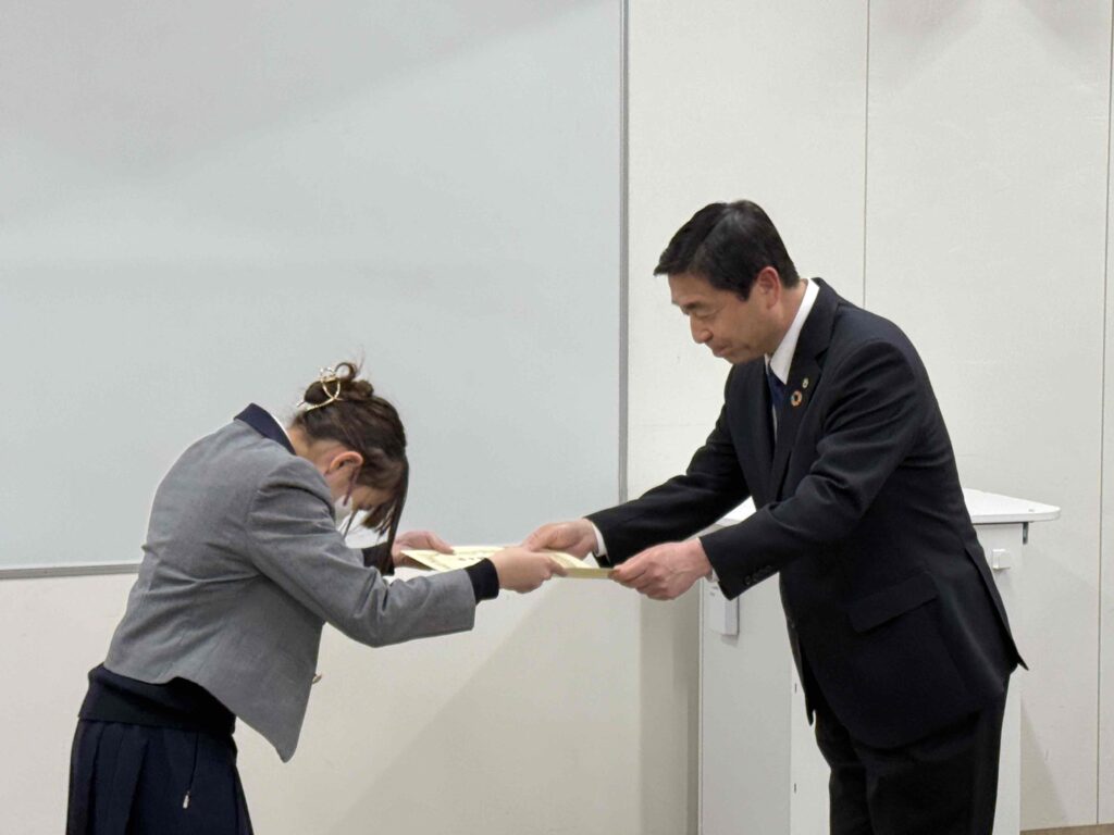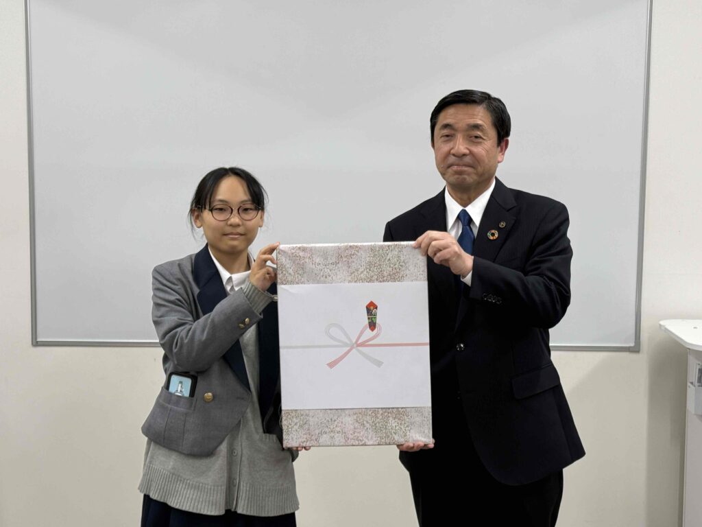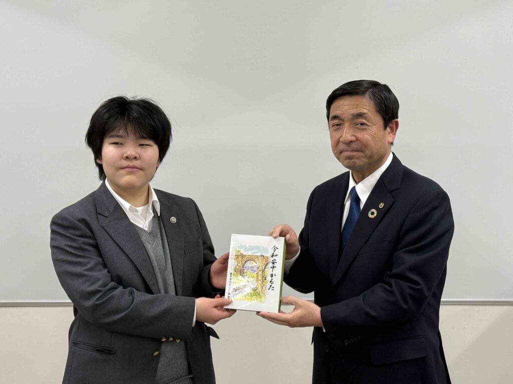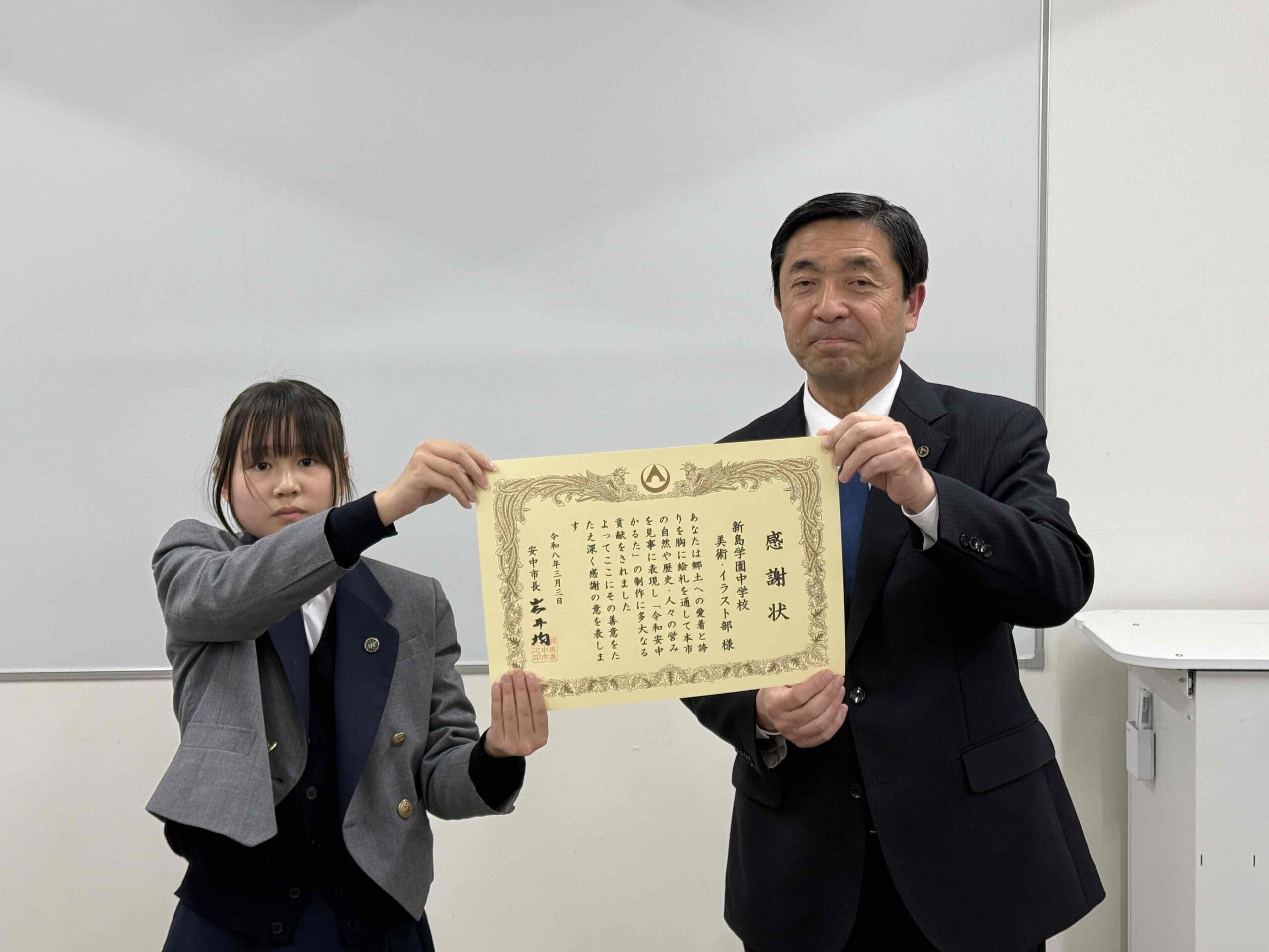 3月3日(火曜日)16時より、本校ラーニングコモンズにおいて令和安中かるた原画制作感謝状贈呈式が行われました。 安中市から清水昭芳副市長、岩﨑聡教育長、井上昇教育部長および関係の職員の方々がご来校され、イラスト部の中学生13名が参加しました。 賞状や記念品、完成したばかりの令和安中かるたと記念クリアファイルをお贈りいただきました。 生徒たちも緊張した面持ちと同時に嬉しそうな表情も浮かべておりました。 ご来校の上、贈呈式を行っていただいた安中市の皆さまに深く感謝申し上げます。 令和安中かるたは、2006年に合併した松井田町の遺構や文化、人物などを加えて新調したものです。 本校は昨年の春に、令和安中かるたの「か、け、さ、し、て、に、ふ、へ、め、わ」の10枚の原画制作を安中市教育委員会より依頼され、夏から秋にかけて制作しました。 その中には、県境に位置する熊野神社や古道東山道、和算と測量の小野栄重など、私たちが初めて耳にする神社や歴史、人物があり、改めて安中 松井田の文化を知る機会となりました。また、原画の構図なども何度もご助言いただいたことは、美術的にも貴重な学びとなりました。 この度、令和安中かるたが完成し、私たち新島学園美術イラスト部が貢献できたことを嬉しく思いますし、実物のかるたを見ると感慨深いものがあります。 この令和安中かるたが、安中市民を中心に広く長く親しまれることを願っています。