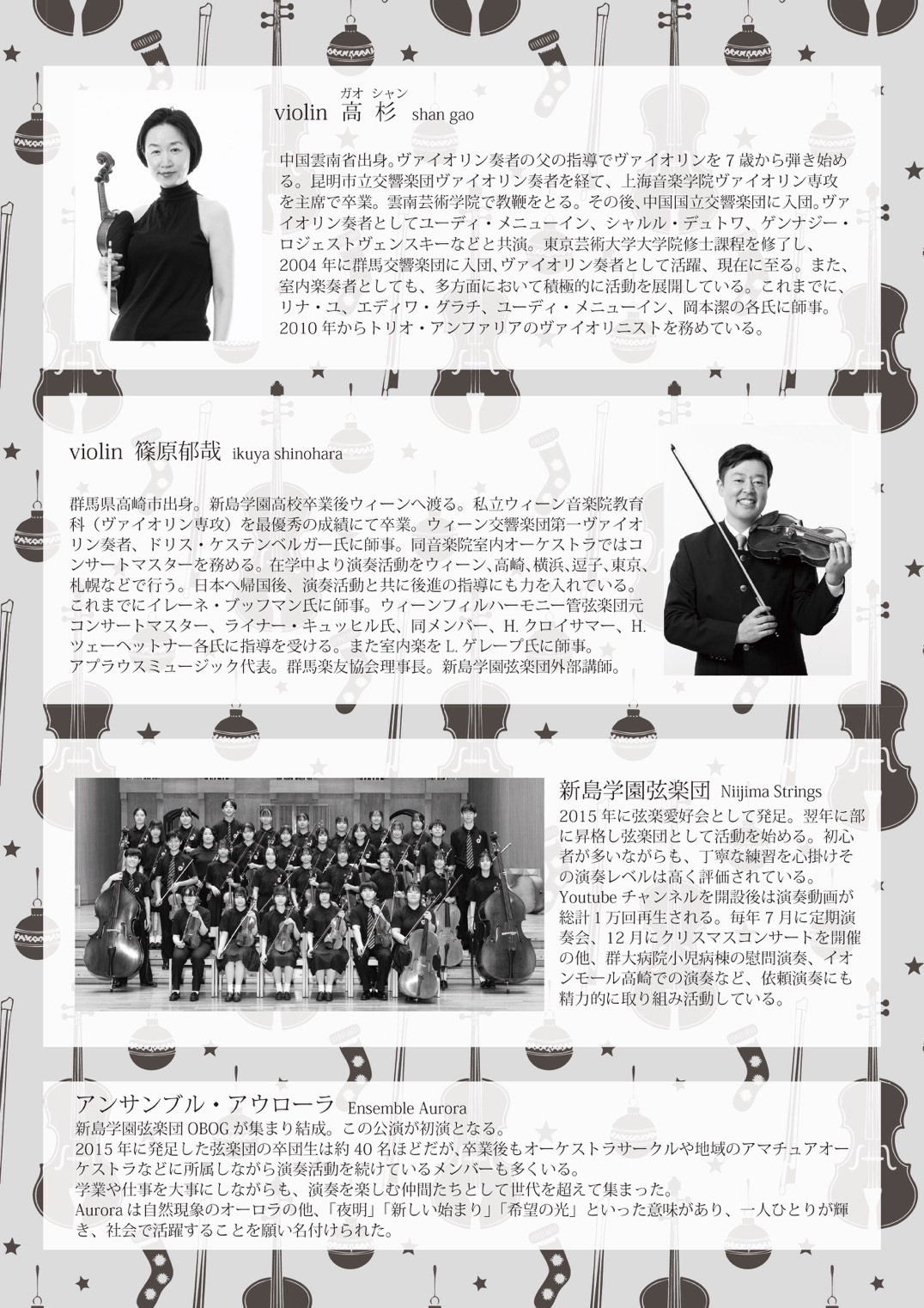 高崎芸術劇場音楽ホールで、ゲスト奏者(群馬交響楽団ヴァイオリニスト:ガオ・シャンさん)をお迎えし共演していただくほか、弦楽合奏の定番曲、クリスマスにちなんだ曲など演奏します。またOB・OGによる演奏も予定しております。