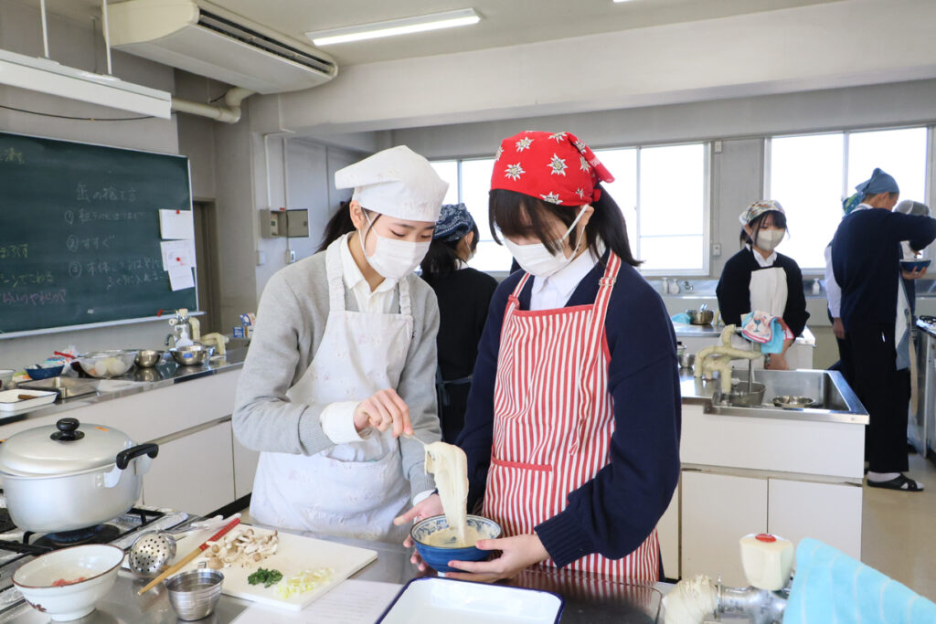 出来上がった熱々のすいとんを口にすると、「もちもちしていておいしい!」と、教室のあちこちから笑顔がこぼれました。